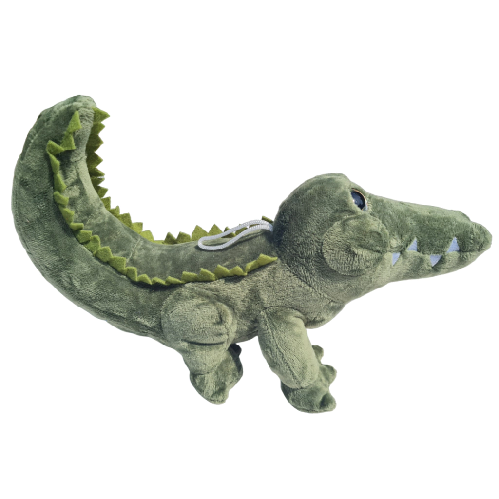 Estos cocodrilos super suaves estan disponibles en dos tamaños de 25CM y 35CM de largo, su tela es de pelo corto y de color verde oscuro, tiene ojos grandes y brillosos.