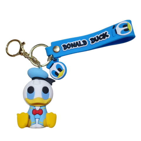 Este llavero de goma es el Pato Donald, personaje de la casa de Mickey Mouse. El llavero incluye una cinta de goma, un gancho para engancharlo en el llavero y unos dijes que le dan un lindo detalle al llaverito.