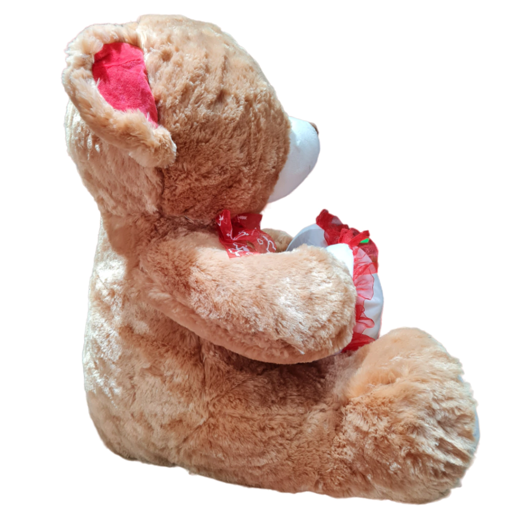 Este lindo oso esta disponible en 90CM de alto. Tiene una tela de pelo largo y muy suave de color marron brilloso y se tiene un corazón de color blanco y rojo con un bordado que dice "te amo"